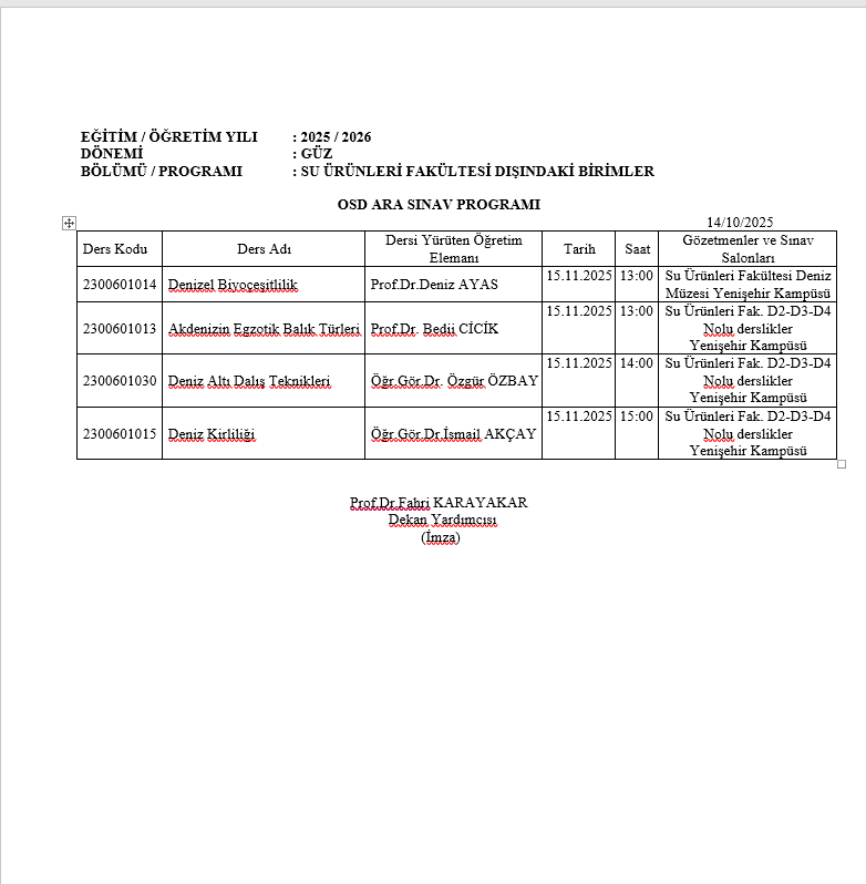 | 13:50-14:30 | 5014015 Den.Mete. Y. ÖZBİLGİN D2 ED-K2-26 | 5014021 Balık Biy. S. KARAYTUĞ D2 ED-K2-26 |